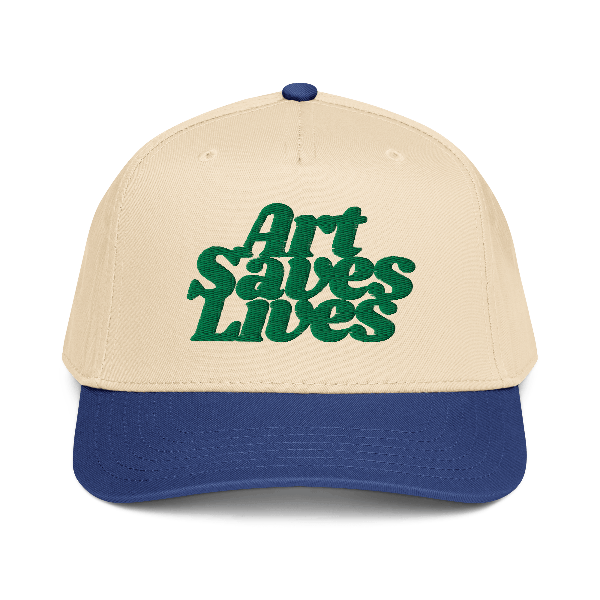 Bold message, clean design. This 5-panel cap features Art Saves Lives embroidered on a structured front panel, making it a standout piece for creators and dreamers. With its mid-profile fit, adjustable snapback, and classic curved visor, it delivers comfort and style in one. A polished everyday accessory for anyone who believes in the power of creativity.