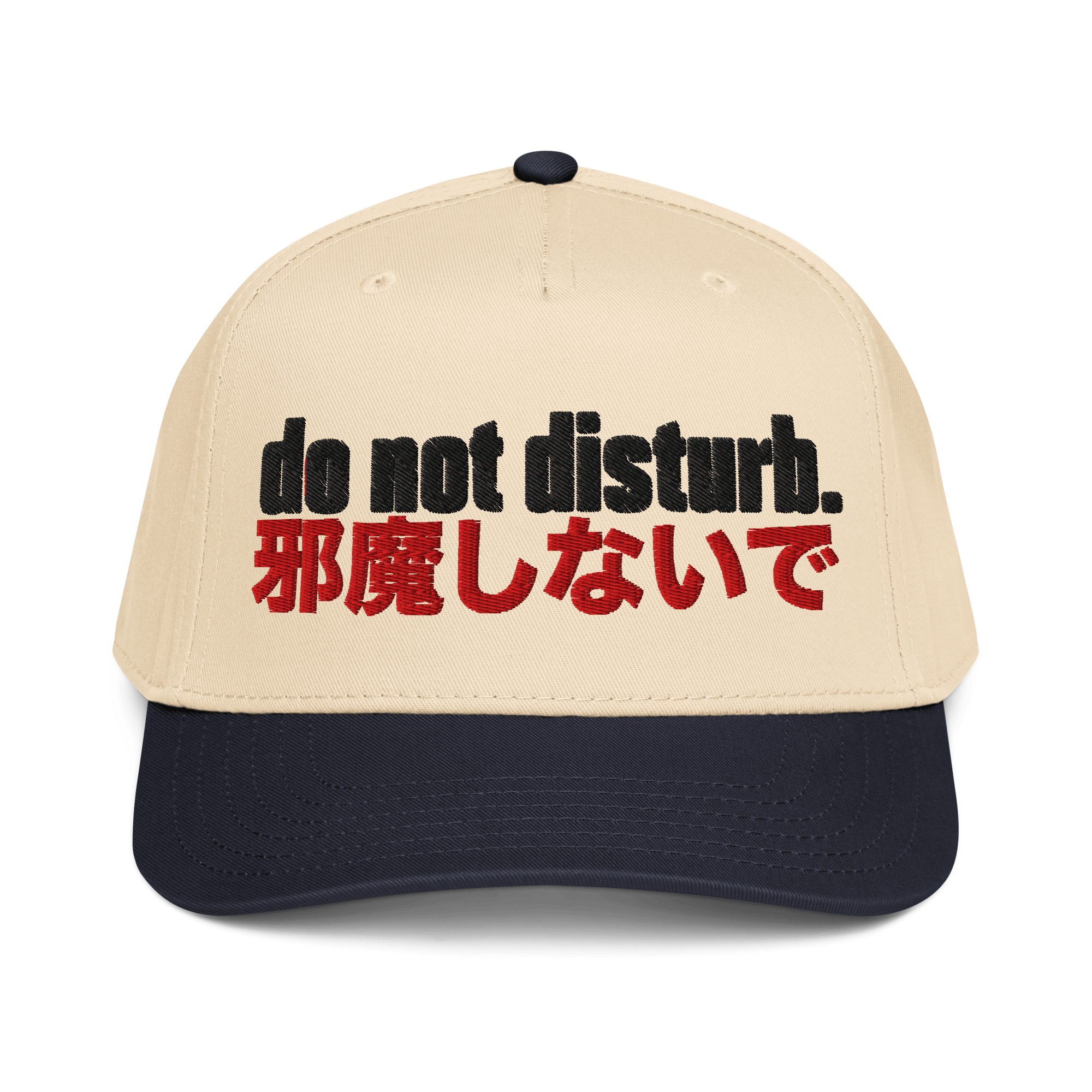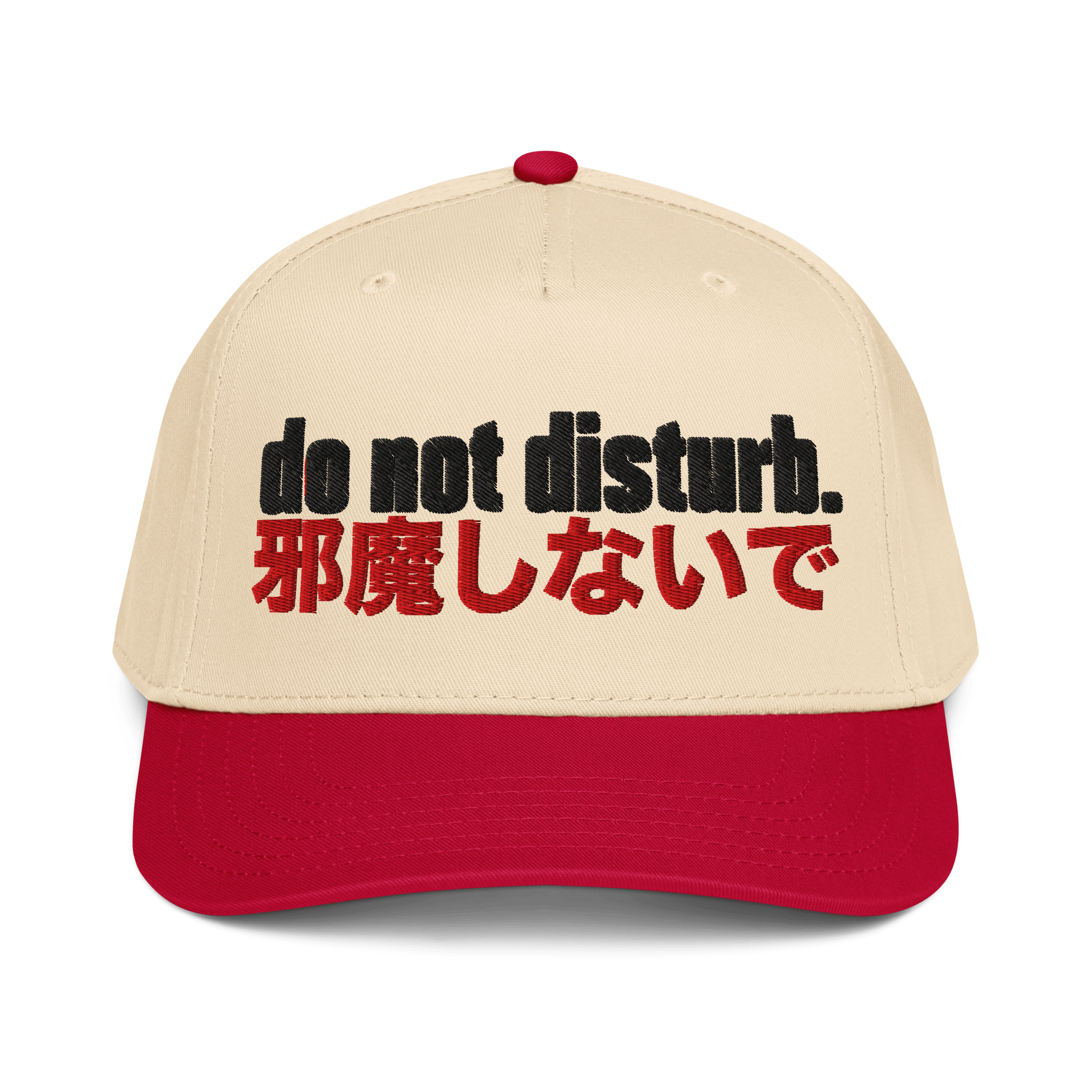 Make your boundaries loud and clear with the Do Not Disturb 5 panel cap. Featuring bold dual-language graphics — do not disturb. in clean white and 邪魔しないで (Japanese for “don’t bother me”) in sharp red — this cap is built to turn heads while keeping you cool. With its structured high-profile fit, breathable mesh back, and matching braid detail, it’s a streetwear essential that combines statement and comfort in one.